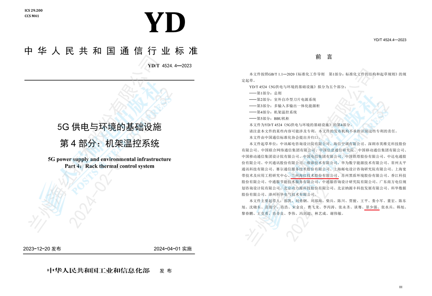 我司參與起草的四項行業(yè)標(biāo)準(zhǔn)《5G供電與環(huán)境的基礎(chǔ)設(shè)施 第4部分:機架溫控系統(tǒng)》(YD/T 4524.4-2023)、《信息通信用末端母線配電系統(tǒng) 第1部分:交流系統(tǒng)》(YD/T 4...