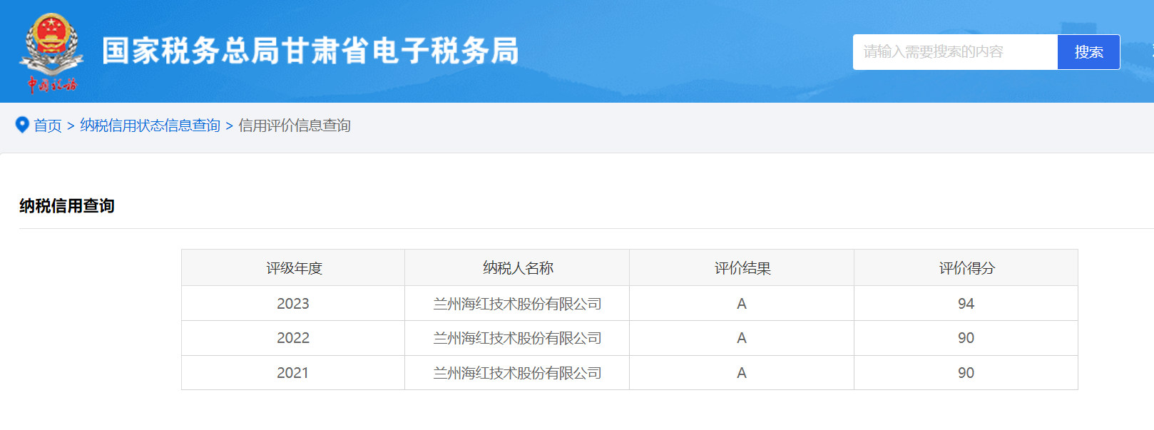 我司被國家稅務(wù)總局甘肅省稅務(wù)局評價為“2023年度納稅信用A級納稅人”