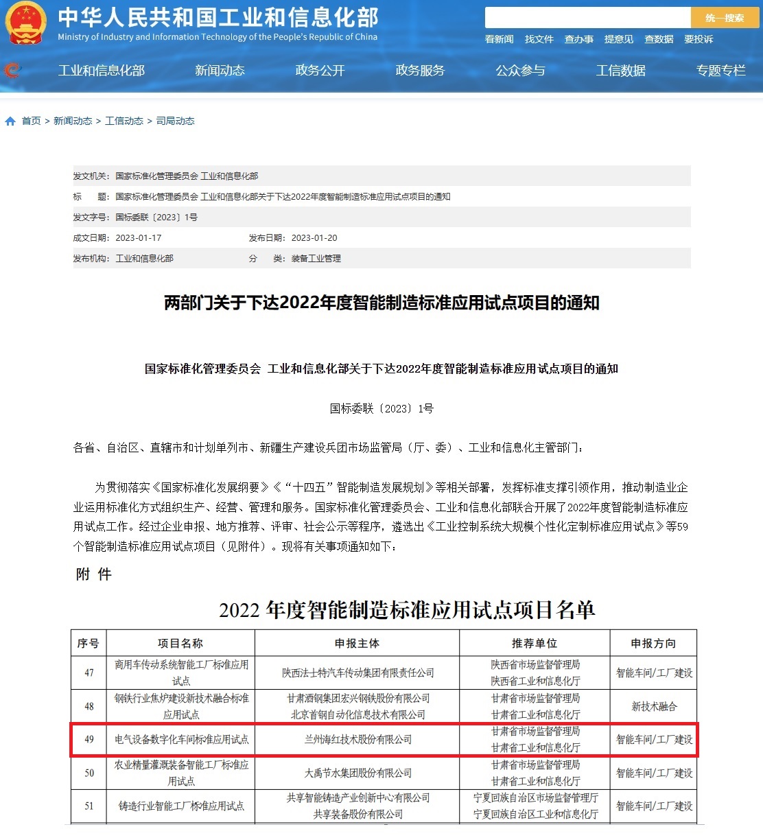 我司入選工信部“2022年度智能制造標準應(yīng)用試點項目名單”
