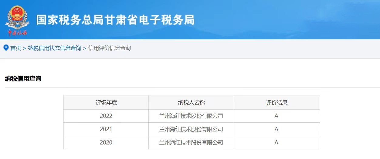 我司被國家稅務(wù)總局甘肅省稅務(wù)局評價為“2022年度納稅信用A級納稅人”