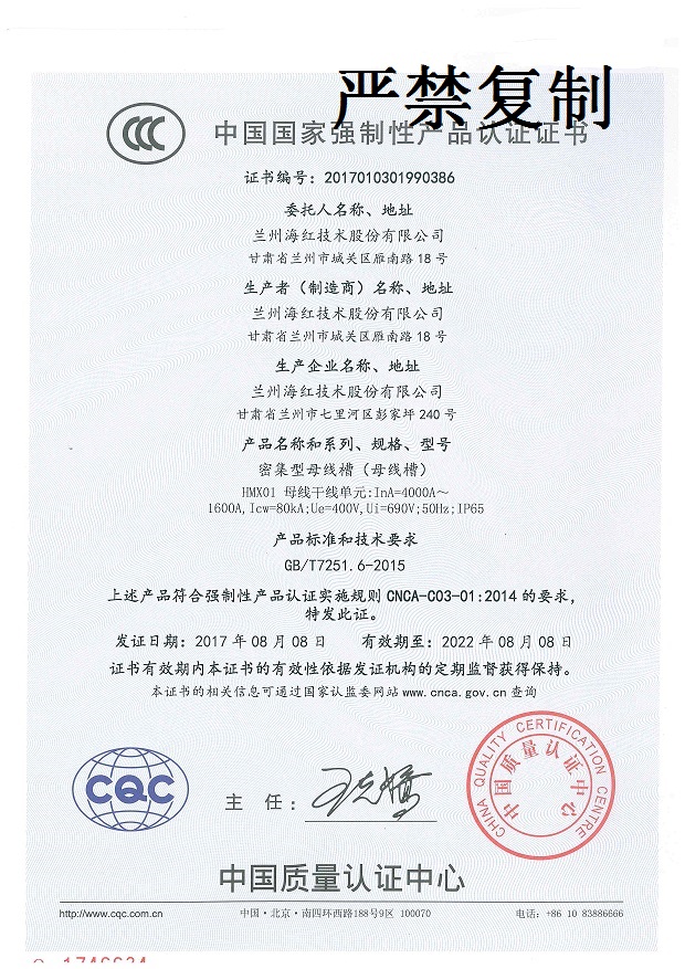 我公司的“密集型母線槽 (HMX01型)與密集型母線槽 (HMX02型)”產(chǎn)品通過中國質(zhì)量認(rèn)證中心的CCC認(rèn)證并取得證書。至此,我公司共取得14個產(chǎn)品的CCC認(rèn)證證書。 我公司的...