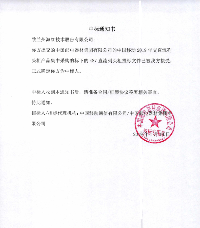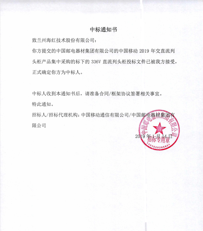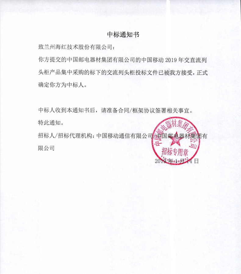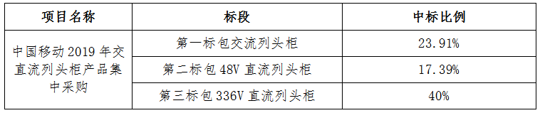 我公司成功中標“中國移動2019年交直流列頭柜”