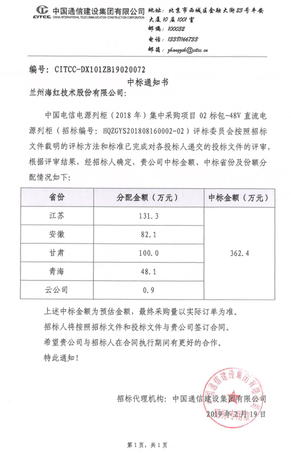 我公司成功中標“中國電信交/直流電源列柜集中采購項目” By 海紅技術 2019-03-14 11:08:42 0次 我公司參與投標的“中國電信交/直流電源列柜集中采購項目”成功中標。此次中標是對我公司技術、工藝、質量、服務等綜合競爭力的再次肯定,將進一步擴大我司的品牌影響力,對2019年度經(jīng)營指標的完成具有重要作用。 上一篇:我公司參與起草的行業(yè)標準《網(wǎng)絡機柜用分布式電源系統(tǒng)》已正式出版 下一篇:我公司“用于通信基站智能新風節(jié)能系統(tǒng)的監(jiān)控單元”發(fā)明專利榮獲甘肅省專利獎