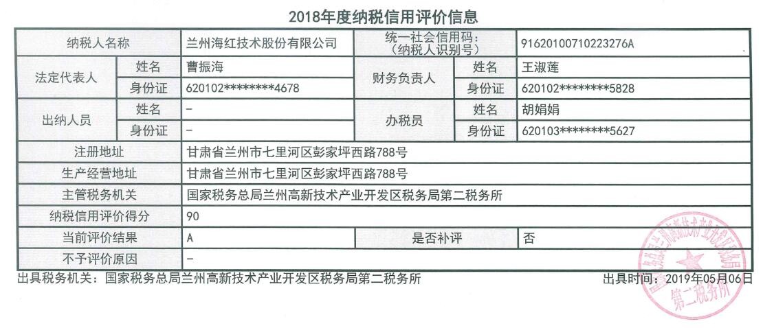 我公司被國家稅務(wù)總局甘肅省稅務(wù)局評價為“2018年度納稅信用A級納稅人”