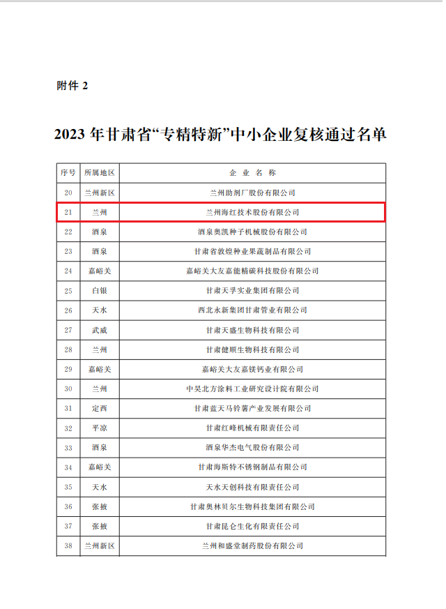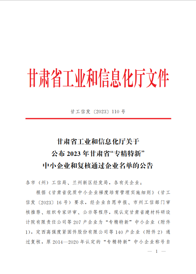 近日,甘肅省工信廳發(fā)布了《關(guān)于公布2023年甘肅省“專精特新”中小企業(yè)和復(fù)核通過企業(yè)名單的公告》(甘工信發(fā)〔2023〕110號),我司通過2023年甘肅省“專精特新”中小企業(yè)復(fù)核。