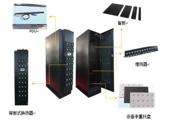 背板式溫控設(shè)備是由背板式換熱器、柜體、PDU(電源分配單元)、盲板、理線器和承重托盤(pán)等配件組成。