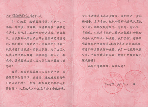 一封來自定西地震災(zāi)區(qū)的感謝信