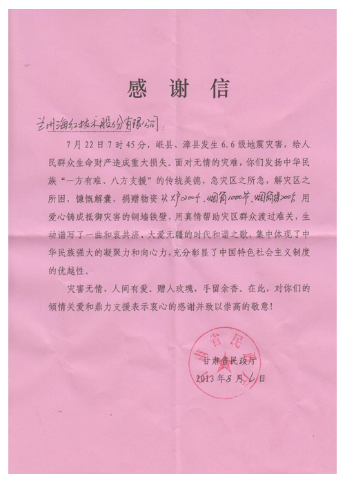 8月初,蘭州海紅技術(shù)股份有限公司收到了來自甘肅省民政廳、岷縣人民政府的感謝信。